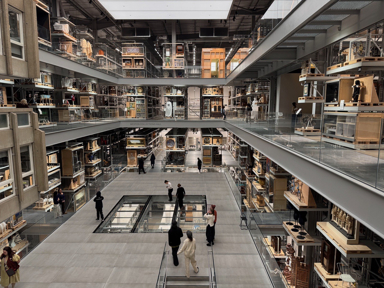 V&A East Storehouse is a new museum space designed to showcase over half a million works from the Victoria and Albert Museum's collection. It is really a storehouse, with objects that are not displayed in the regular V&A museums. It offers visitors a behind-the-scenes experience of how museum objects are collected, cared for, and displayed. There are 3 floors with 20–30 endcaps that the museum has specifically selected, with QR codes to give detailed information about the objects. There are ceramics, paintings, objects from around the world, displays about theater costumes, clothes from around the world, a section on a razed 20th century brutalist (architectural style) community housing project showing sample rooms and audio from the residents, a complete installation of the Frank Lloyd Wright Edgar Kaufmann office donation by Kaufmann’s son, etc. There are sections on how the museum handles its objects, how it restores them, and about a bit of an apology for objects taken from countries that Britain colonized. There is also a David Bowie room, donated by David Bowie himself, which displays some costumes and memorabilia, and copies of his notes that visitors can look at.