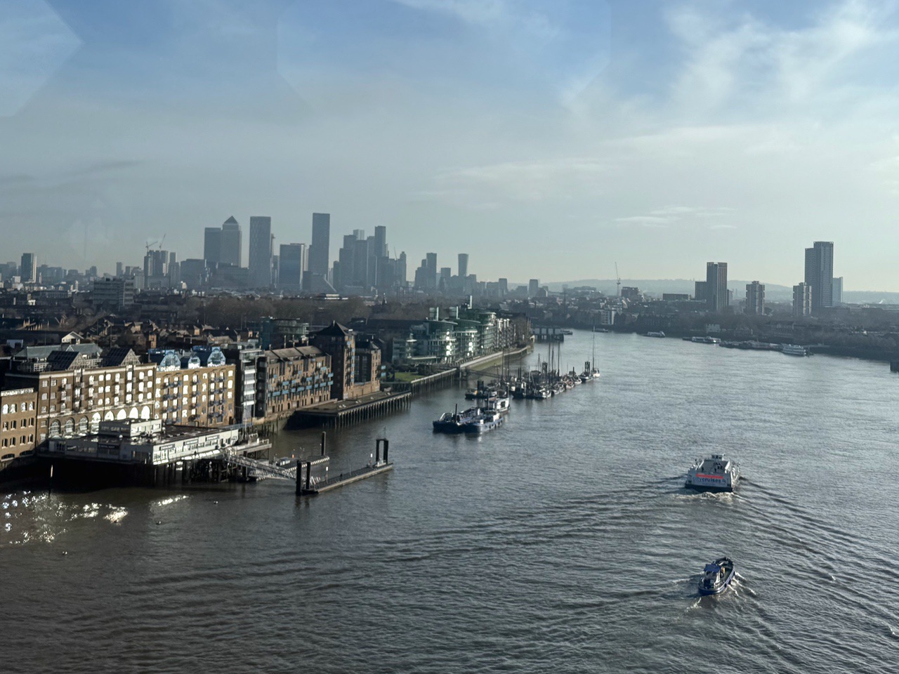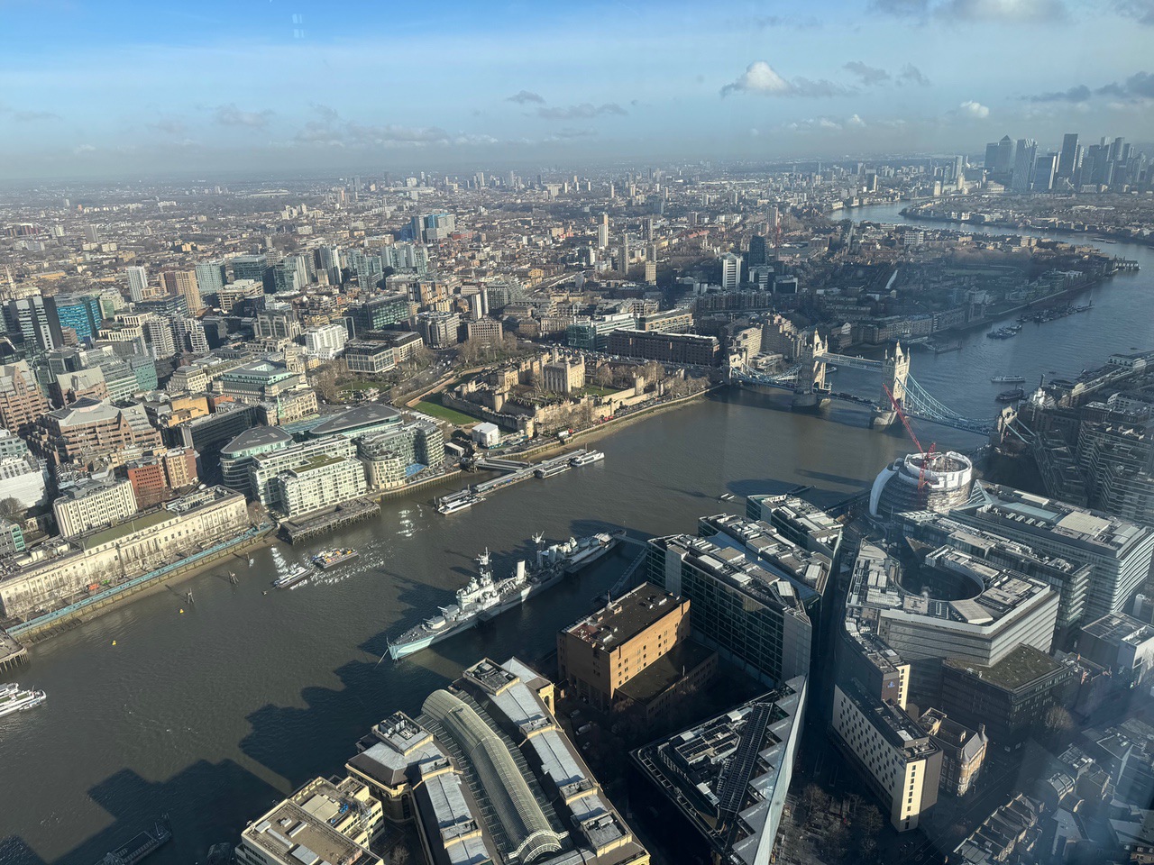 Looking east toward the The Tower of London, HMS Belfast, Tower Bridge Canary Wharf from the Shard.